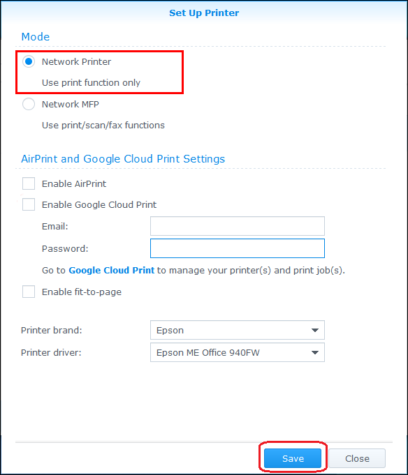 - 網絡打印機:為僅支持打印的打印機或如果您要讓客戶端僅使用打印功能選擇此模式。